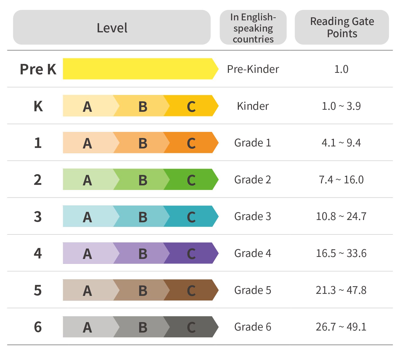 The Reading Gate program consists of 22 levels, and the breakdown for each level is provided in the chart below. Please keep in mind that these are general standards. Because of individual differences, it is recommended that you start with the Reading Level that matches your skillset.